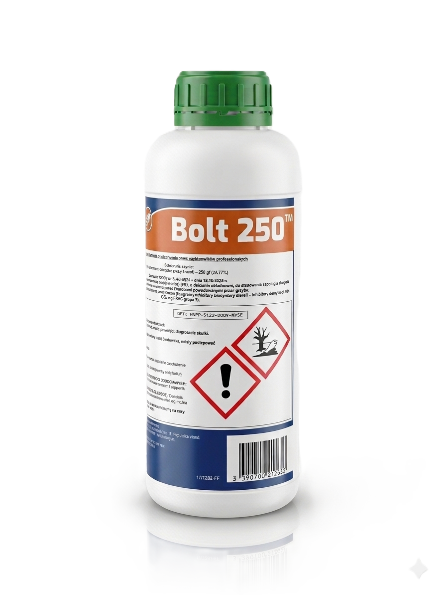 Bolt 250 to systemiczny fungicyd zawierający protiokonazol (250 g/l), przeznaczony do skutecznej ochrony pszenicy, jęczmienia, pszenżyta i żyta przed chorobami grzybowymi. Działa zapobiegawczo, interwencyjnie i wyniszczająco, eliminując infekcje i zabezpieczając plony przed stratami.