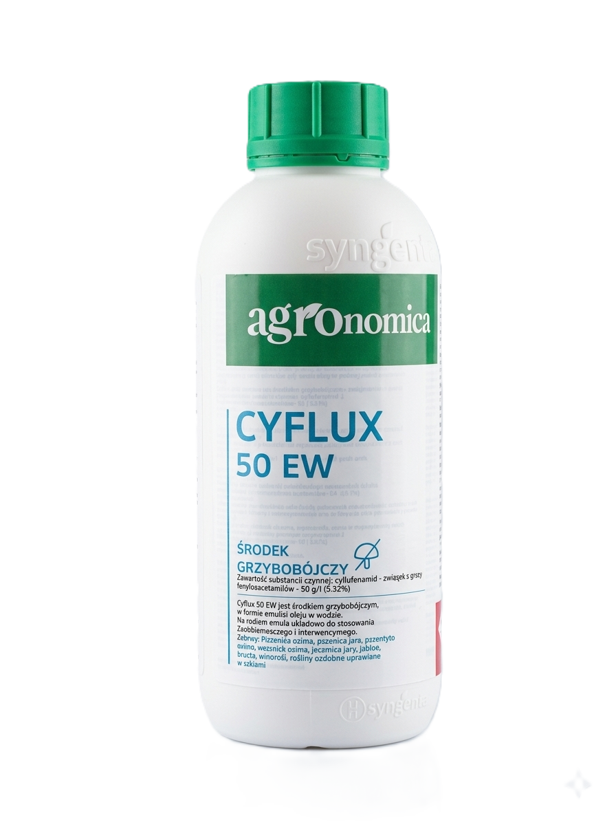 Uwagi: W uprawie jęczmienia jarego środek CYFLUX 50 EW ogranicza występowanie następujących chorób: plamistość siatkowa liści jęczmienia, rdza jęczmienia, rynchosporioza zbóż. W uprawie jęczmienia ozimego środek CYFLUX 50 EW ogranicza występowanie następujących chorób: plamistość siatkowa liści jęczmienia, rynchosporioza zbóż.