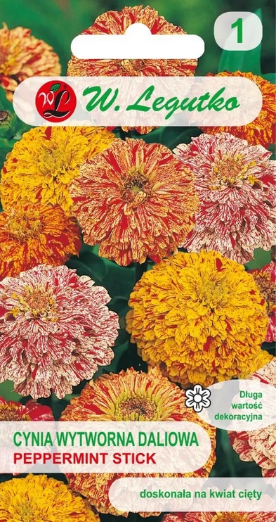 Odmiany tworzące mieszankę Peppermint Stick charakteryzują się wielobarwnymi kwiatostanami, o charakterystycznie nakrapianych płatkach. Rośliny tworzą pojedyncze kwiaty, rozwijające się na wierzchołkach pędów, o pełnych koszyczkach kwiatostanowych. Kwiatostany obficie wypełniają dwa rodzaje kwiatów. Centralną część zajmują mocno zagęszczone i silnie zwinięte kwiaty rurkowate, otoczone zewnętrznym otokiem, nachodzących na siebie, kwiatów języczkowych. Kwiatostany są niejednolite kolorystycznie, kolor dominujący posiada liczne plamy i smugi, o kontrastującym wybarwieniu. Wśród barw przeważają, typowe dla gatunku kolory, takie jak biały, żółty, pomarańczowy, różowy i czerwony. Rośliny zakwitają na początku lipca i utrzymują intensywne wybarwienie aż do października, zamierając wraz z pierwszymi, jesiennymi przymrozkami.