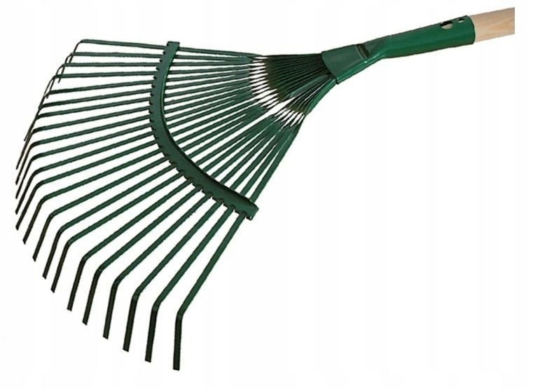 Grabie do liści z taśmy, z drewnianym trzonkiem, wykonane z wysokiej jakości materiałów.