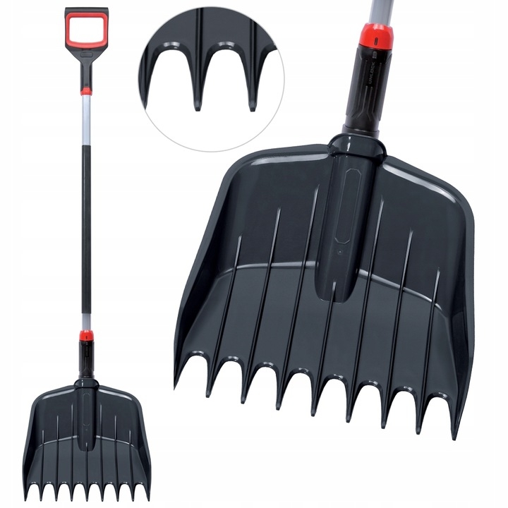 Łopato-grabie sprawdzą się również przy pracach ogrodniczych np. podczas grabienia i załadunku liści. Wysokiej jakości trzon aluminiowy zapewnia wytrzymałość, a gumowe pokrycie ergonomię i wygodę podczas pracy.