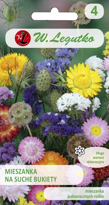 Mieszanka kilkunastu gatunków traw i roślin ozdobnych jednorocznych używanych do tworzenia suchych bukietów i kompozycji. Wysiew w kwietniu-maju wprost do gruntu w rozstawie 25 x 30 cm. Stanowisko słoneczne. Wysokość roślin 50 - 100 cm. Kwitną od lipca do późnej jesieni.