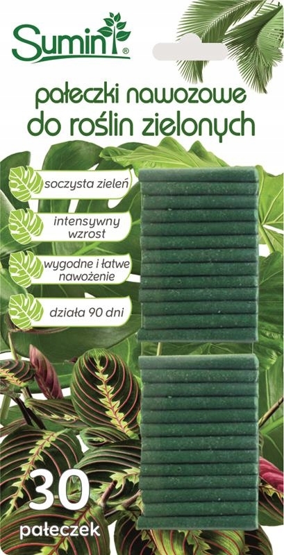 Pałeczki nawozowe do roślin zielonych firmy Sumin przeznaczone są do nawożenia roślin zielonych uprawianych w doniczkach, w tym roślin egzotycznych i kolekcjonerskich, takich jak monstery, filodendronów, sagowców, noliny, alokazji, maranty. Pałeczki dostarczają niezbędnych składników pokarmowych zapewniając odpowiedni wzrost oraz wzmocnienie roślin uprawianych w mieszkaniach i domach.Pałeczki w przeciwieństwie do płynu, nie spływają z wodą na dno doniczki, lecz cały czas pozostają w strefie korzeniowej.