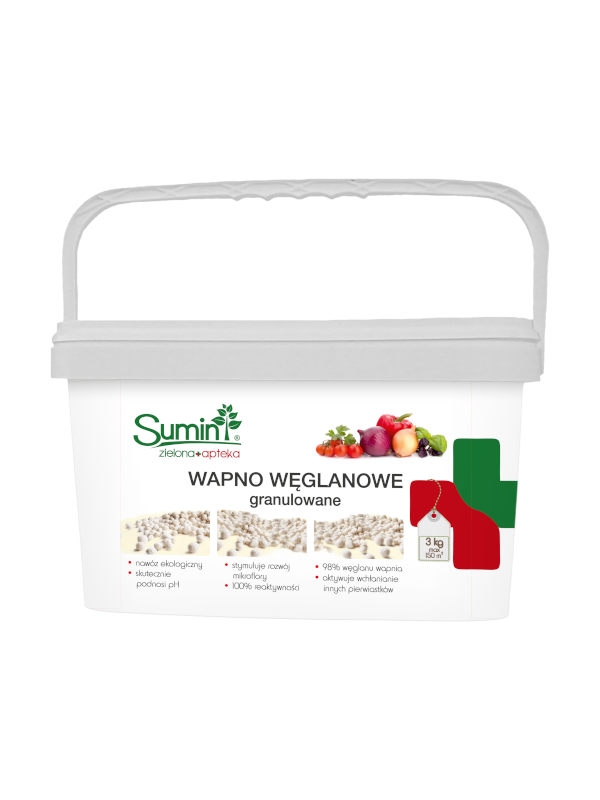 Wapno węglanowe granulowane produkowane jest w technologii ekologicznej, z naturalnych kopalin, bez obróbki chemicznej. Szybko podnosi odczyn gleby, co przekłada się na wzrost efektywności pobierania przez rośliny składników pokarmowych. Umożliwia to rozwój pożądanej mikroflory, co wpływa na przebieg procesu mineralizacji materii organicznej w glebie i jednocześnie ogranicza rozwój chorobotwórczych grzybów. Termin stosowania: okres po zbiorach warzyw i owoców (późne lato do późnej jesieni) oraz okres wiosenny.